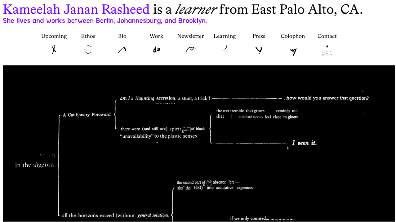 adapted from Katherine McKittrick, irregularly updated, these objects, references, readings, poems, images, and notes are temporaly situated, a way of remembering process, conveying how knowledge and learning are knotted and cyclical, what’s currently informing or inspiring my thinking, and/or what I am currently thinking about or making